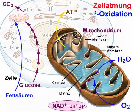Die vom Organismus aufgenommene Nahrung wird verdaut, ins Blut aufgenommen, in die Zellen verteilt und dort oxidiert, um Speicherenergie ATP zu produzieren. Die Oxidation des Traubenzuckers (Glucose), der in den meisten kohlenhydrathaltigen Speisen enthalten ist heißt Zellatmung, die Oxidation der Fettsäuren aus den Fetten nennt man